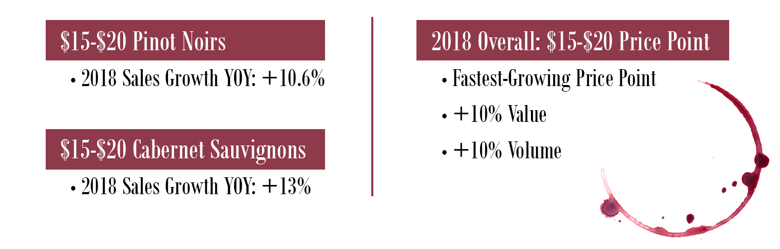 However, did you know that in 2018, varietals like Pinot Noir and Cabernet Sauvignon—classic cold-weather wines—played well all year long? And there is a very particular price point with these two picks that consumers cozied up to in the last year.