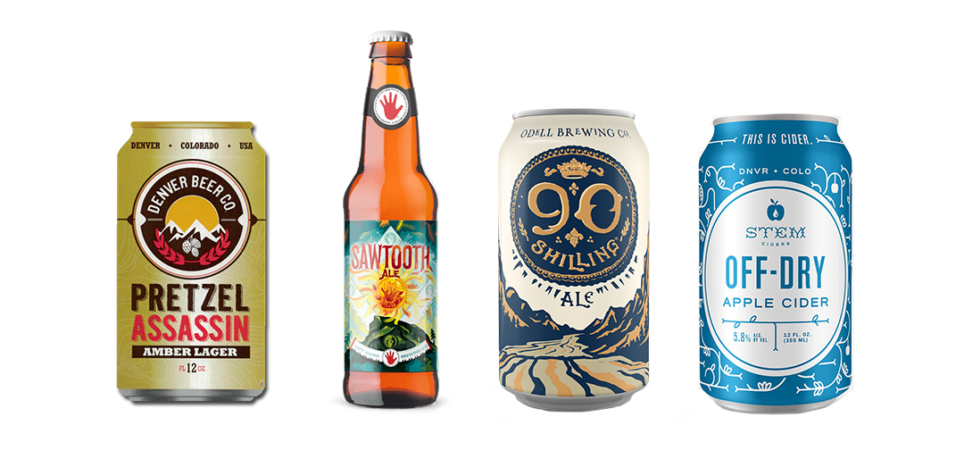 Left to Right: Denver Beer Co. Pretzel Assassin Amber Lager, Left Hand Sawthooth Ale, Odell 90 Shilling Ale, Stem Ciders Off-Dry Apple Cider