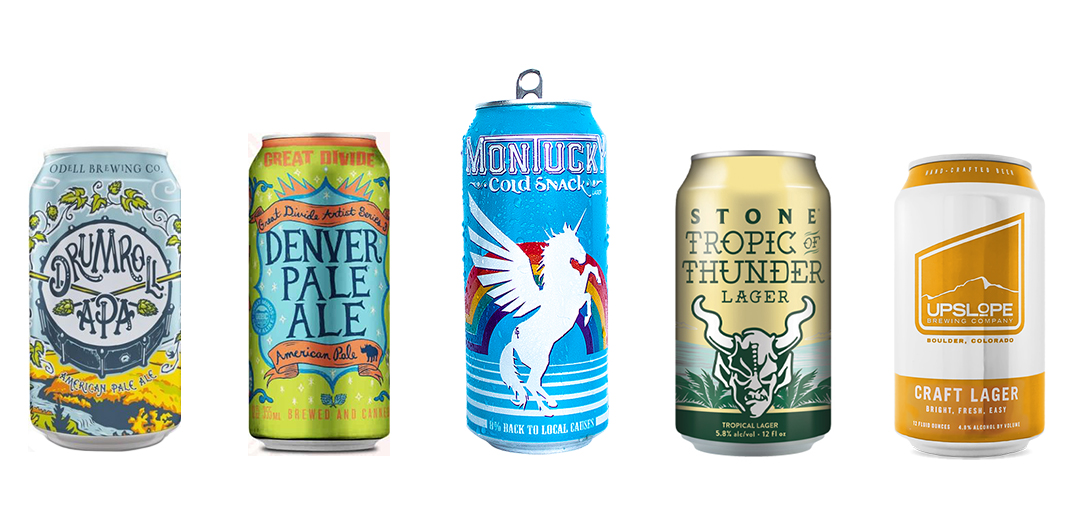 Left to Right: Odell Drum Roll American Pale Ale, Great Divide Denver Pale Ale, Monkucy Cold Snacks Lager, Stone Tropic of Thunder Lager, Upslope Craft Lager