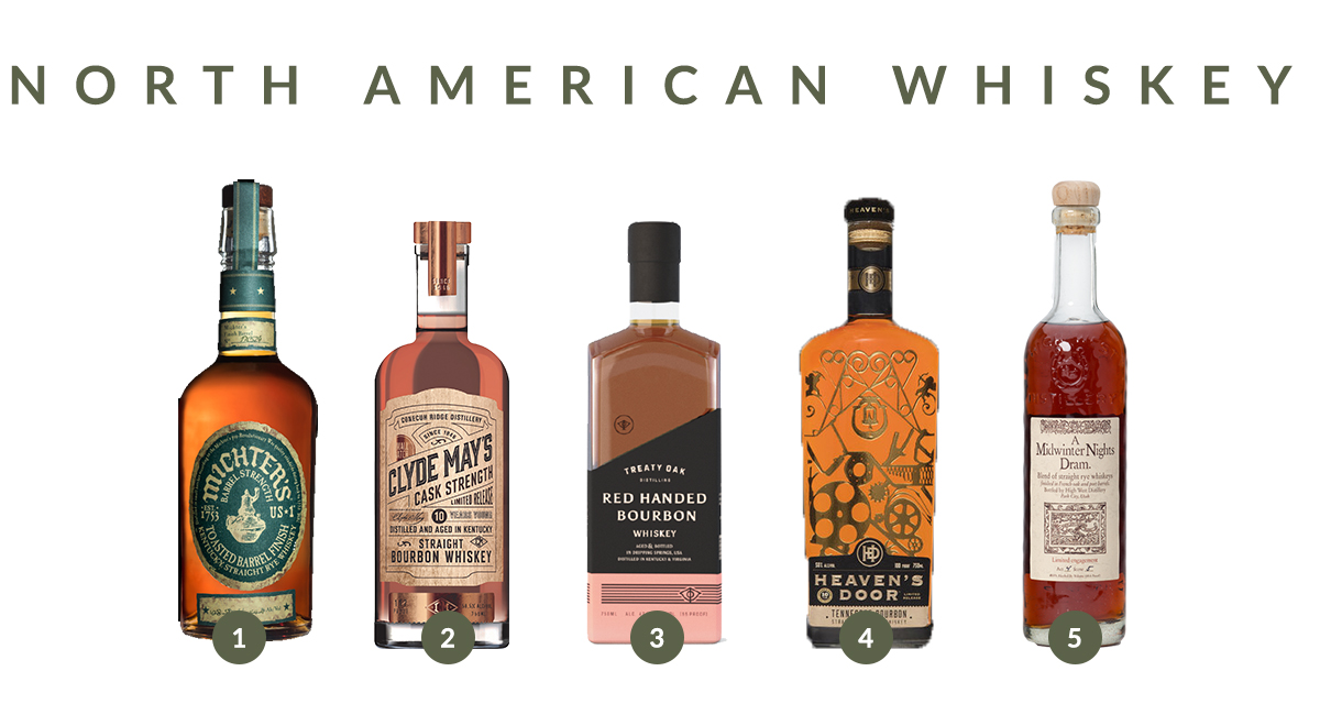 1) Michter's Barrel Strength Toasted Barrel Finish, 2) Clyde May's Cask Strength Bourbon, 3) Treaty Oak Red Handed Bourbon, 4) Heaven's Door Tennessee Bourbon Limited 10 Year Release, 5) High West A Midwinter Nights Dram