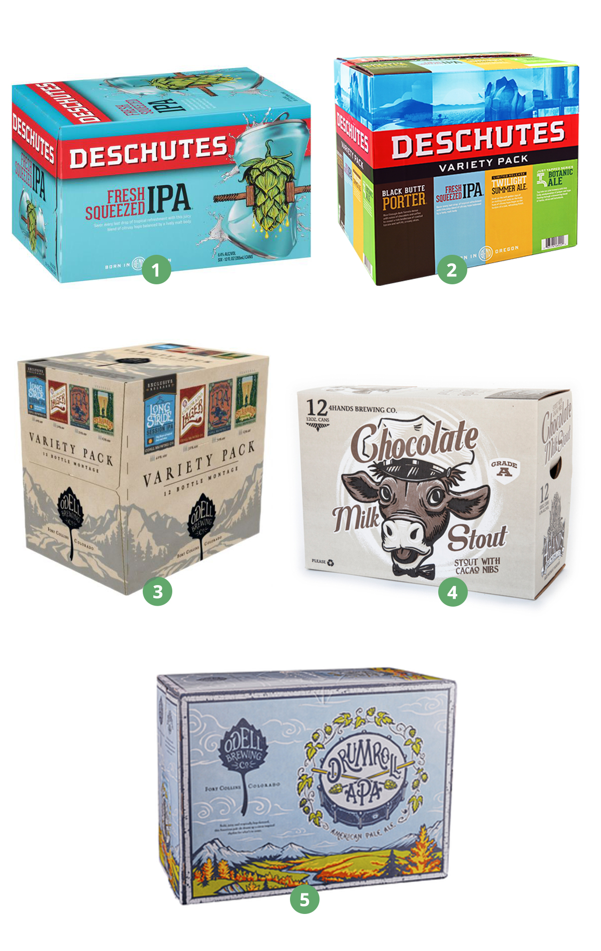 1. Deschutes Fresh Squeezed IPA 12 Pack Cans, 2. Deschutes Variety Pack, 3. Odell Montage Variety Pack, 4. 4 Hands Milk Chocolate Stout 12 Pack Cans, 5. Odell Drumroll American Pale Ale 12 Pack Cans.