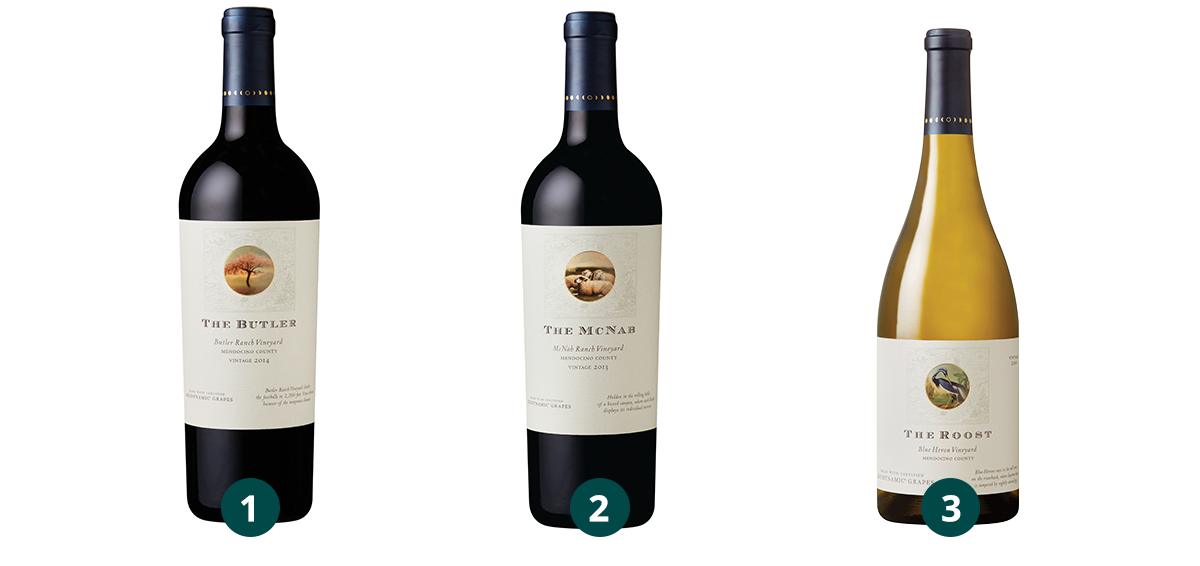 1.) Bonterra Single Vineyard The Butler Red Blend, 2.) Bonterra Single Vineyard The McNab Red Blend, 3.) Bonterra Single Vineyard The Roost Chardonnay
