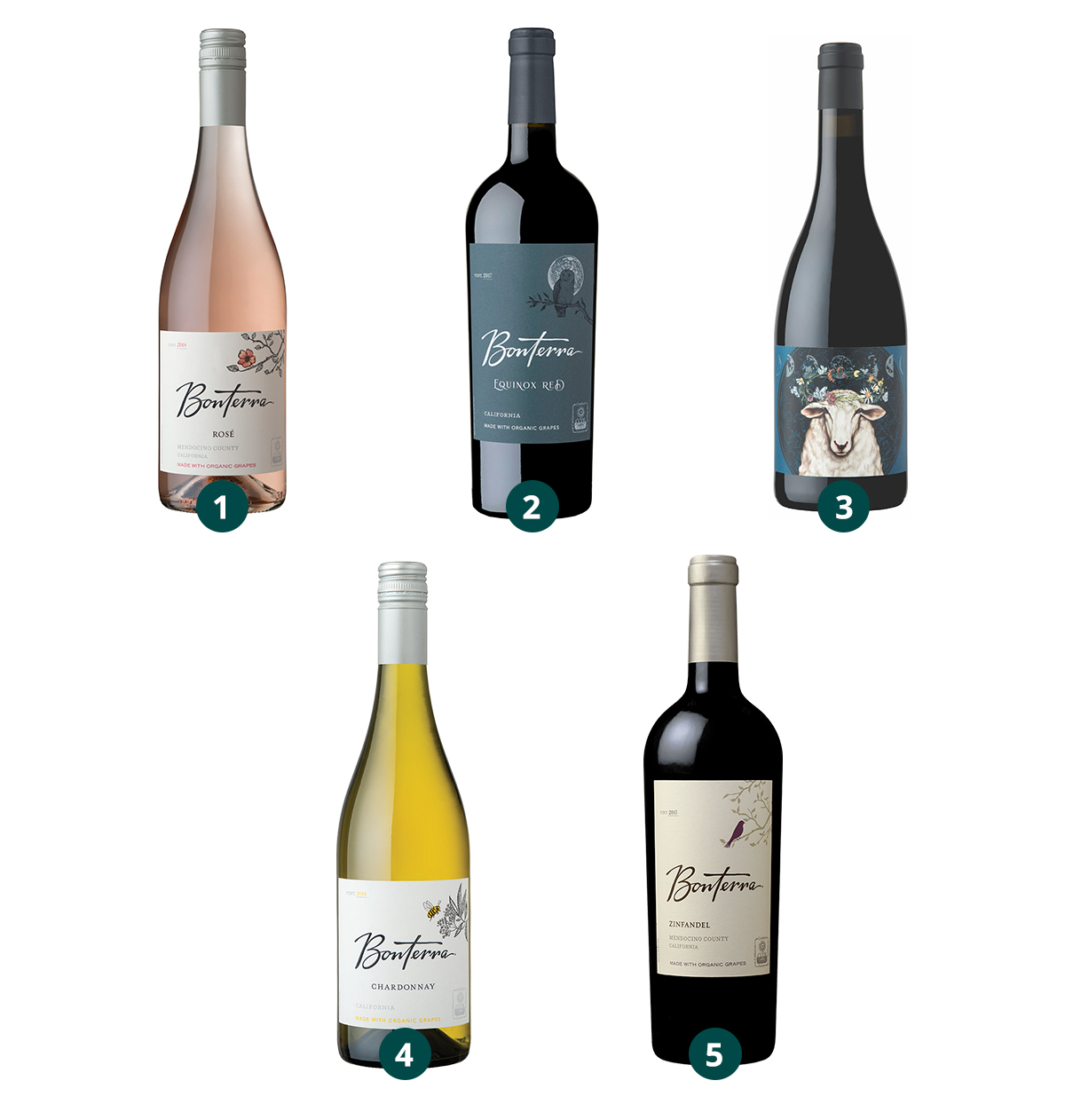 1.) Bonterra Rosé, 2.) Bonterra Equinox Red, 3.) Bonterra Elysian Collection Merlot, 4.) Bonterra Chardonnay, 5.) Bonterra Zinfandel