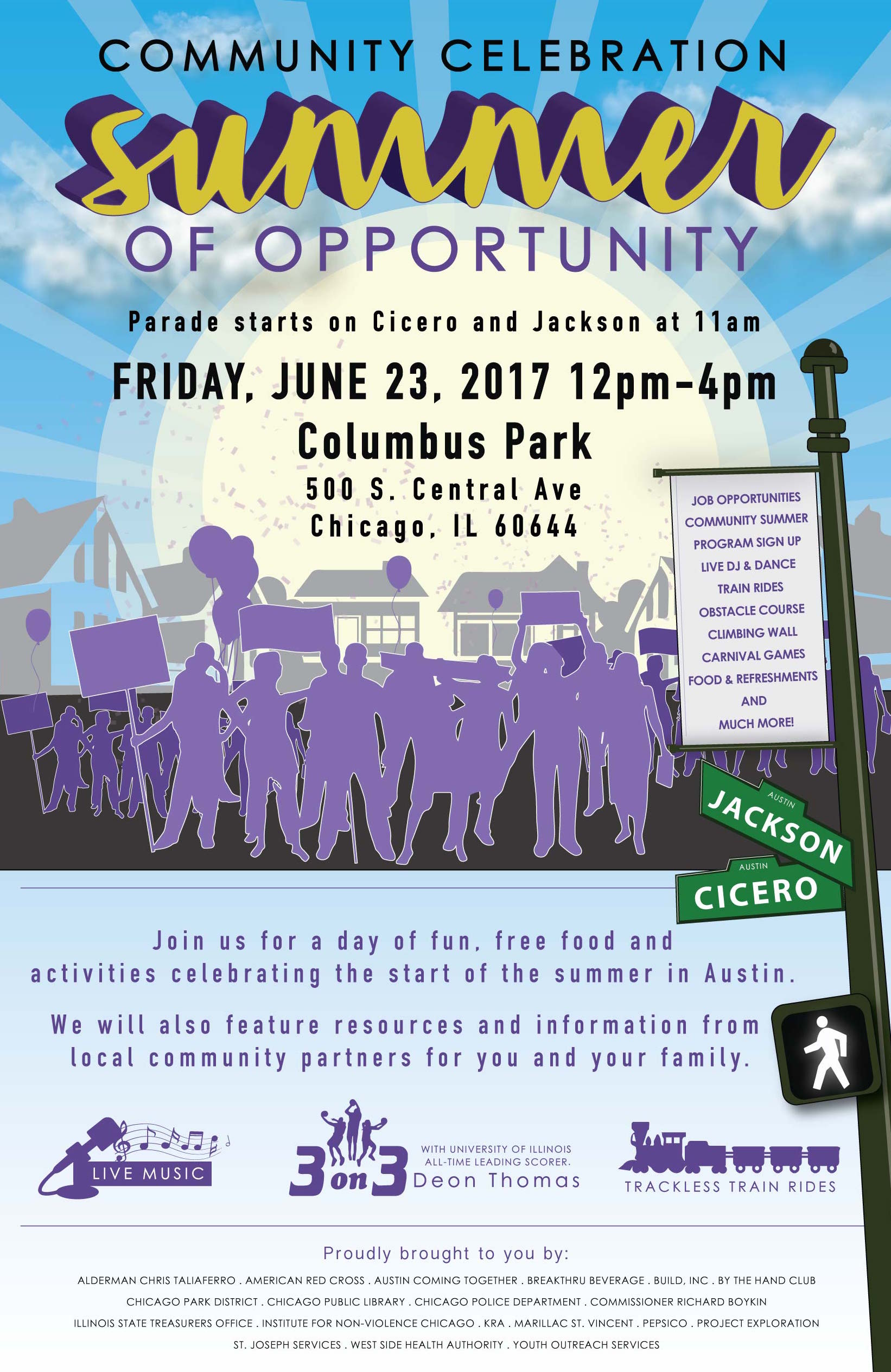 The Summer of Opportunity will take place June 23rd in the Austin neighborhood, and will include a short “Parade for Peace” and a celebration in Columbus Park. June 23rd marks the end of the school year and the beginning of the summer, which is a very vulnerable time for our city’s youth. With this event, we hope to raise awareness and support for combatting Chicago’s youth violence, and to empower our city to advocate for change. If you’d like to join us in supporting this mission and to help make the Summer of Opportunity a success, please follow this link to make a donation.
