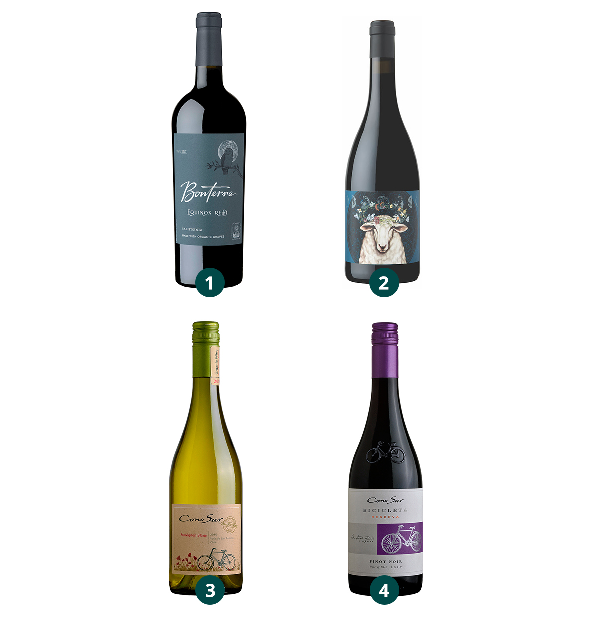 1.) Bonterra Equinox Red, 2.) Bonterra Elysian Collection Merlot, 3.) Cono Sur Sauvignon Blanc, 4.) Cono Sur Bicileta Reserva Pinot Noir