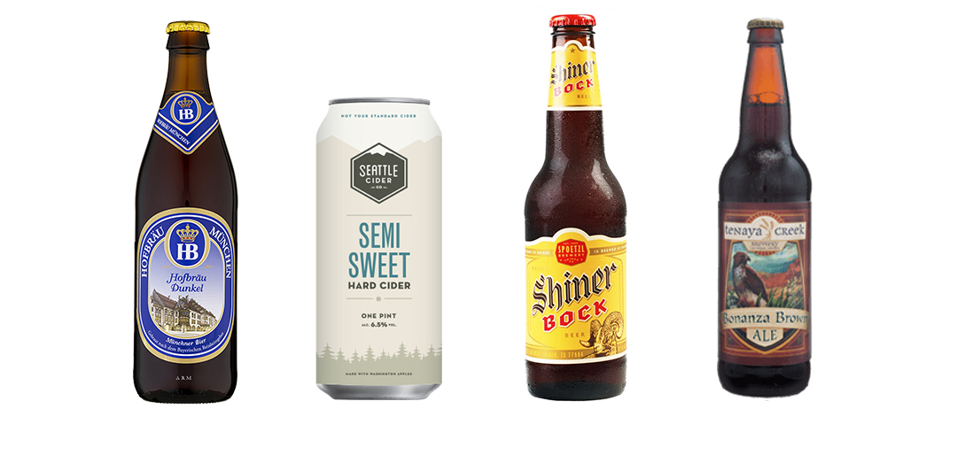 Left to Right: Hofbrau Dunkel, Seattle Cider Semi Sweet Cider, Shiner Bock (Las Vegas ONLY), Tenaya Creek Bonanza Brown Ale