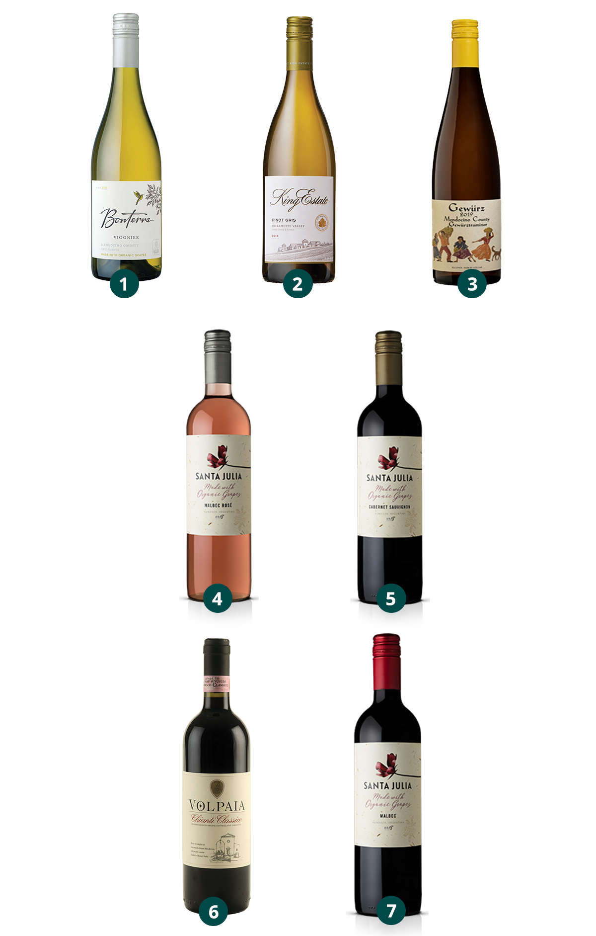 1.) Bonterra Viognier, 2.) King Estate Pinot Gris, 3.) Alexander Valley Vineyards Gewürztraminer, 4.) Santa Julia Organica Malbec Rosé, 5.) Santa Julia Organica Cabernet Sauvignon, 6.) Volpaia Chianti Classico, 7.) Santa Julia Organica Malbec
