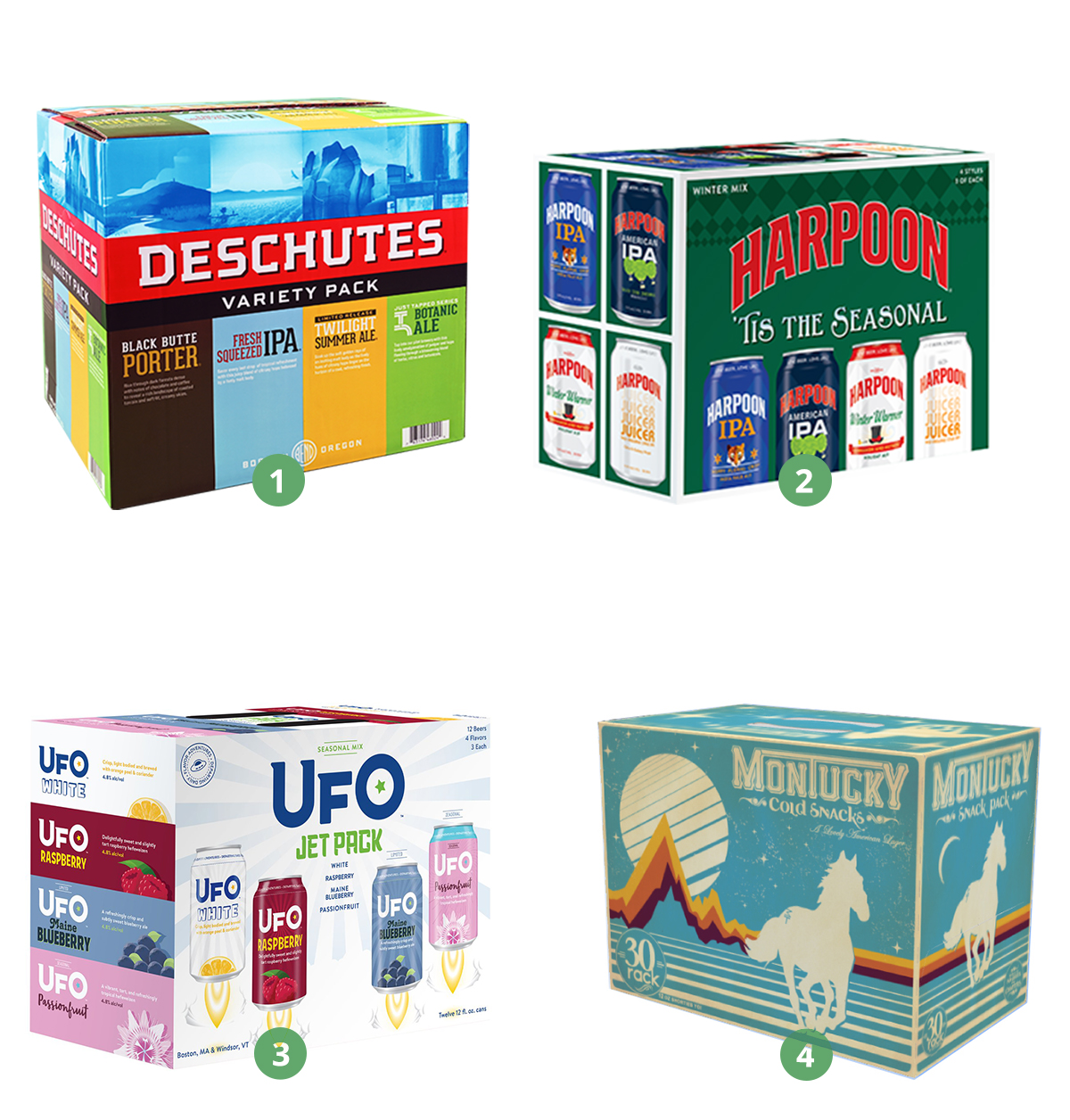 1. Deschutes Variety 12 Pack, 2. Harpoon 'Tis the Seasonal Variety Pack, 3. UFO Jet Pack, 4. Montucky Cold Snacks 30 Pack
