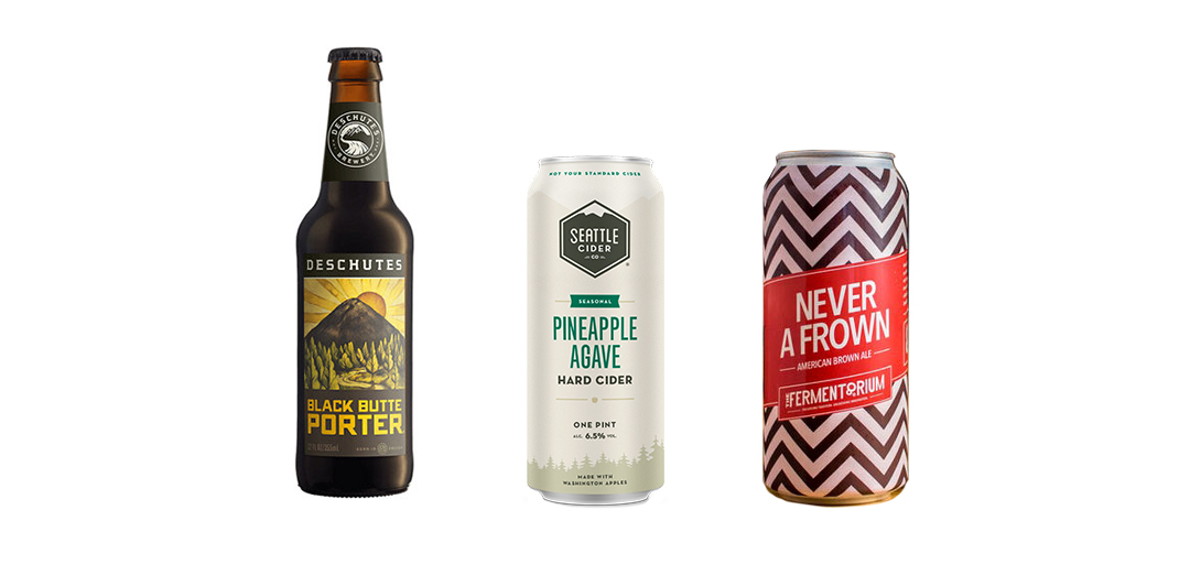 Left to Right: Deschutes Black Butte Porter, Seattle Cider Pineapple Agave Cider, The Fermentorium Never a Frown American Brown Ale