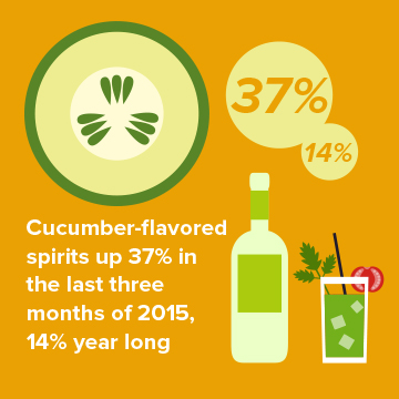 Consumer demand for cucumber-flavored spirits has skyrocketed up 37% in the last three months of the year and up 14% over last year, outpacing fruit-flavored spirits and flavored spirits in general (IRI data for 52 weeks ending Jan. 24, 2016).